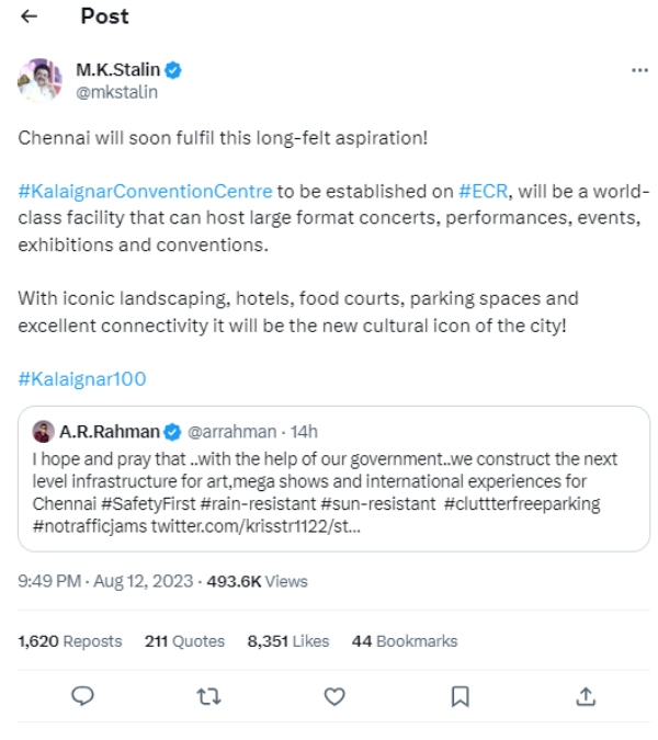 இதற்கு பதில் அளித்துள்ள முதல்வர் ஸ்டாலின், சென்னை இந்த கோரிக்கையை விரைவில் நிறைவேற்றும் எனவும் ஈசிஆரில் நிறுவப்படும் kalaignar convention centre பெரிய வடிவ கச்சேரிகள், நிகழ்ச்சிகள் மற்றும் மாநாடுகளை நடத்தக்கூடிய உலகத்தரம் வாய்ந்த வசதியாக இருக்கும் இயற்கையான சூழலில் ஹோட்டல்கள் மற்றும் உணவு விடுதிகள் என அனைத்தும் இந்த சென்டரில் இருக்கும் இடம் முதல்வர் ஸ்டாலின் தெரிவித்துள்ளார். வருத்தத்துடன் ஏ ஆர் ரகுமான் வெளியிட்ட பதிவுக்கு உடனே முதல்வர் ஸ்டாலின் பதிலளித்த இவ்வாறு கூறியிருப்பது தற்போது இணையத்தில் வைரலாகி வருகிறது.
