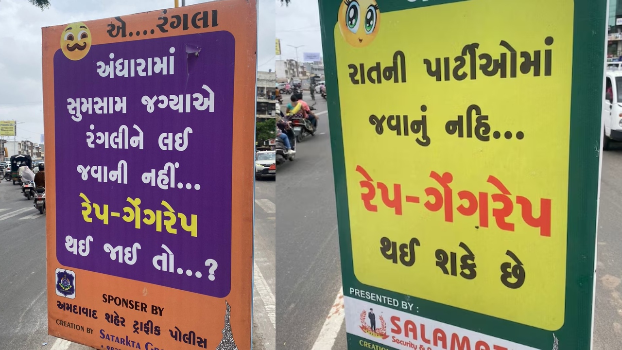 அகமதாபாத் நகரில் சோலா மற்றும் சாணக்கிய புரி பகுதிகளில் பெண்களைப் பற்றிய சில சுவரொட்டிகள் வைக்கப்பட்டுள்ளது பெரும் சர்ச்சையை ஏற்படுத்தியது. மேலும் இந்த சுவரொட்டிகளில் எழுதப்பட்ட வாசகங்கள் மிகவும் ஆட்சேபனைக்குரியதாகவும் பெண்களுக்கு எதிரான உணர்ச்சியாகவும் கருதப்படுகிறது. அதாவது அந்த சுவரொட்டியில், ஹே ரங்லி இரவு விருந்துக்கு செல்லாதே பாலியல் வன்கொடுமை மற்றும் கூட்டு பாலியல் வன்கொடுமை நடக்கலாம் என்றும், மறுபுறம், ஹே ரங்கா இருண்ட இடத்திற்கு அழைத்துச் செல்லாதே பாலியல் வன்கொடுமை அல்லது கூட்டுப் பாலியல் வன்கொடுமை நடந்தால் என்ன செய்வது? என்று எழுதப்பட்டிருந்தது.