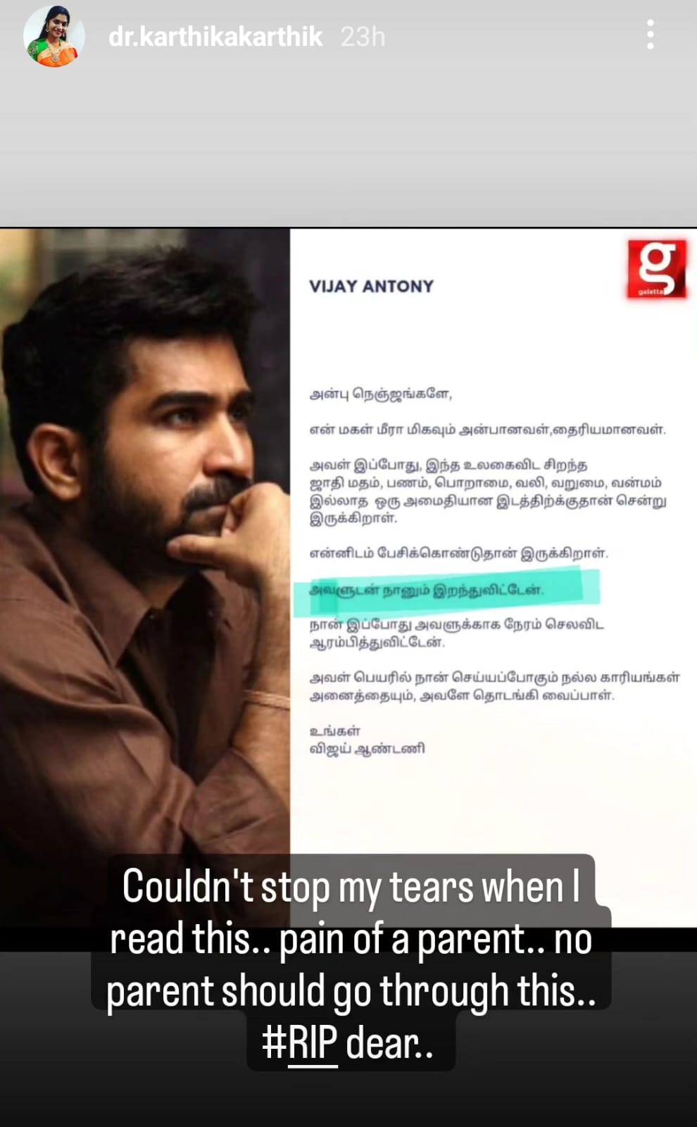 நடிகர் விஜய் ஆண்டனியின் மகள் மீரா மர்மமான முறையில் தூக்கிட்டு தற்கொலை செய்து கொண்டார். இதனால் மொத்த திரையுலகமே சோகத்தில் மூழ்கியது. இதற்கான உண்மைக்காரணம் என்னெவென்று இதுவரை தெரியவில்லை. இதைத்தொடர்ந்து நடிகர் விஜய் ஆண்டனி மறைந்த மகளின் மறைவு குறித்து உருக்கமான பதிவு ஒன்றை வெளியிட்டிருந்தார். தற்பொழுது இப்பதிவினை பார்த்து ‘என்னால் என் கண்களிலிருந்து வரும் கண்ணீரை அடக்க முடியவில்லை. இது எந்த பெற்றோருக்கும் ஏற்படக்கூடாத வலி’ என கூறி வருத்தத்துடன் தெரிவித்துள்ளார் நடிகர் தனுஷின் அக்கா கார்த்திகா தேவி. இதோ அந்த புகைப்படம்….