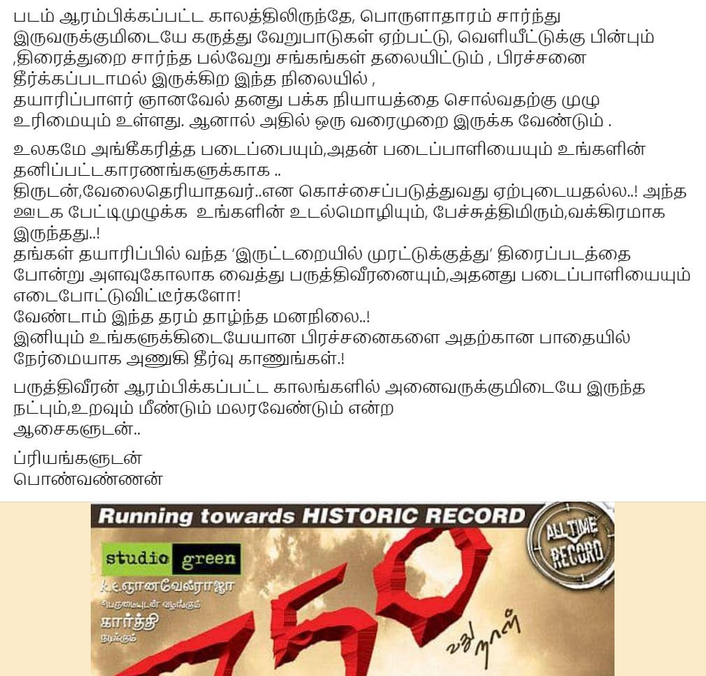 தங்கள் தயாரிப்பில் வந்த ‘இருட்டறையில் முரட்டுக்குத்து’ திரைப்படத்தை போன்று அளவுகோலாக வைத்து பருத்திவீரனையும், அதனது படைப்பாளியையும் எடைபோட்டு விட்டீர்களோ! வேண்டாம் இந்த தரம் தாழ்ந்த மனநிலை. இனியும் உங்களுக்கிடையேயான பிரச்சனைகளை அதற்கான பாதையில் நேர்மையாக அணுகி தீர்வு காணுங்கள். பருத்திவீரன் ஆரம்பிக்கப்பட்ட காலங்களில் அனைவருக்கும் இடையே இருந்த நட்பும்,உறவும் மீண்டும் மலர வேண்டும் என்ற ஆசைகளுடன்..”என்று அவர் குறிப்பிட்டுள்ளார்.
