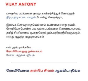 குறிப்பாக புளூ சட்டை மாறன், தனது வழக்கமான ஸ்டைலில் இத்திரைப்படத்தை மிகவும் கடுமையாக விமர்சனம் செய்திருந்தார். இந்த நிலையில் நடிகர் விஜய் ஆண்டனி தனது “X” தளத்தில் ஒரு பதிவை பகிர்ந்திருக்கிறார்.