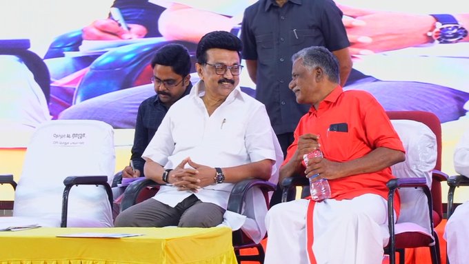 சேலத்தில் நடைபெற்று வரும் இந்திய கம்யூனிஸ்ட் கட்சியின் மாநில மாநாட்டில் கலந்து கொண்ட முதலமைச்சர் மு.க.ஸ்டாலின் பேசியதாவது, ““கருப்பும், சிவப்பும் சேர்ந்ததுதான் திமுக. எங்களில் பாதி நீங்கள். நமக்குள் இருப்பது கொள்கை நட்பு. இந்த கொள்கை உறவின் ஆழத்தை நாம் தலைமுறைகள் கடந்து சொல்ல வேண்டும். சேலத்தில் சிறைத் தியாகிகள் நினைவாக ஒரு மணிமண்டபம் அமைக்கப்படும். முத்தரசன் வைத்த கோரிக்கையை நாம் தட்டி கழிக்க முடியுமா? என்று பேசியுள்ளார்.