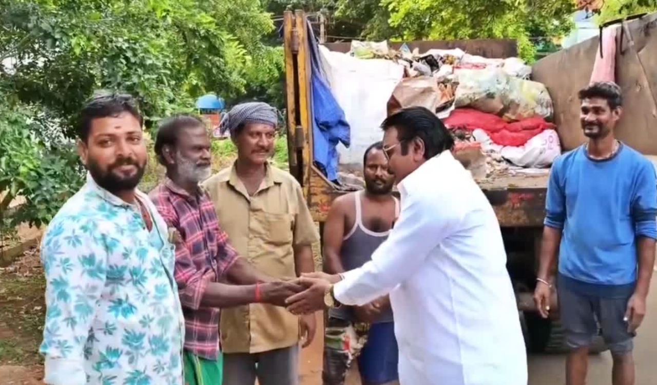 தஞ்சாவூர் மாவட்டம், விஜயகாந்த் பிறந்தநாளை ஒட்டி அவரைப் போலவே வேடமிட்டு தூய்மை பணியாளர்களுக்கு விருந்து அளித்த தொண்டரை அனைவரும் பாராட்டி...