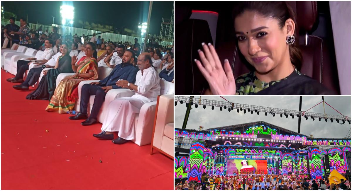 ‘கலைஞர் 100’ விழா தமிழ்த் திரைப்படத் தயாரிப்பாளர் சங்கம் சார்பில் சென்னையில் கிண்டியில் உள்ள ரேஸ் கோர்ஸ் மைதானத்தில் நேற்று பிரம்மாண்டமாக நடத்தப்பட்டது. இந்த விழாவில் சூப்பர் ஸ்டார் ரஜினிகாந்த் தனது மனைவி லதா ரஜினிகாந்த்துடன் கலந்து கொண்டார். அதே போல கமல், சூர்யா, தனுஷ், நயன்தாரா, கீர்த்தி சுரேஷ், கௌதமி, நடிகர் சிவராஜ் குமார், அமைச்சர் உதயநிதி ஸ்டாலின், நடிகர் வடிவேலு, கார்த்தி, பார்த்திபன், ஆர்.ஜே.பாலாஜி, இயக்குநர் வெற்றிமாறன், நடிகை ரோஜா ஆகியோரும் கலந்து கொண்டனர்.