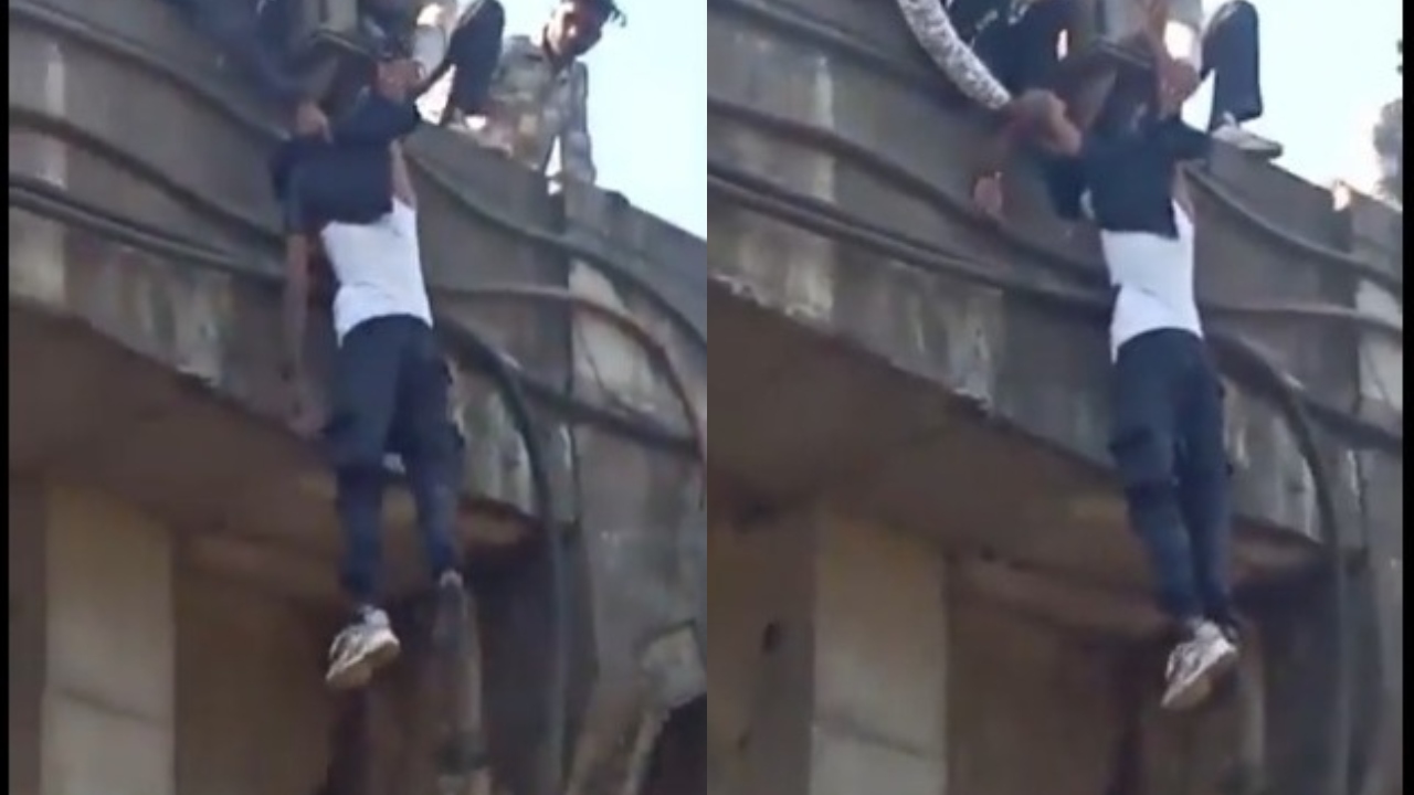 இதில் தூக்கி வீசப்பட்ட அவர், பாலத்தின் தடுப்புச் சுவரைக் கடந்து கீழே விழ இருந்த நிலையில், அதிர்ஷ்டவசமாக அவரது சட்டை அங்கிருந்த மின் கம்பத்தில் சிக்கிக்கொண்டது. சுமார் 20 அடி உயரத்தில் அந்த இளைஞர் உயிருக்குப் போராடியபடி அந்தரத்தில் தொங்கிக்கொண்டிருந்த காட்சி காண்போரை பதற வைத்தது.