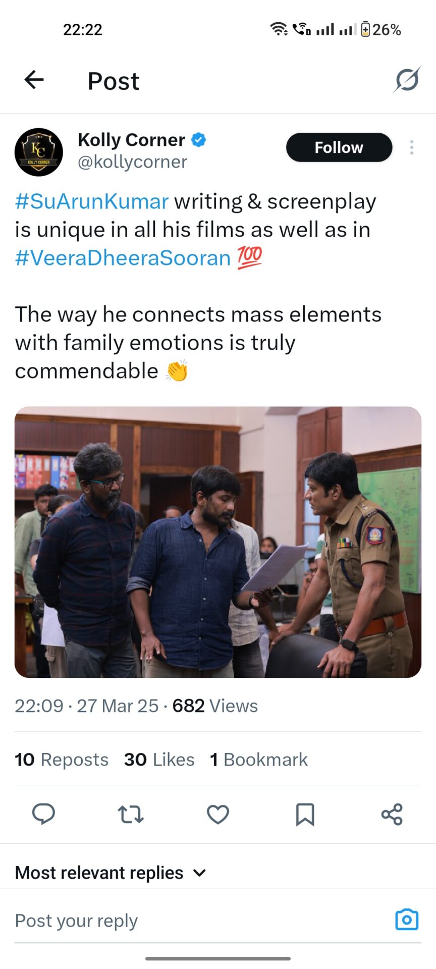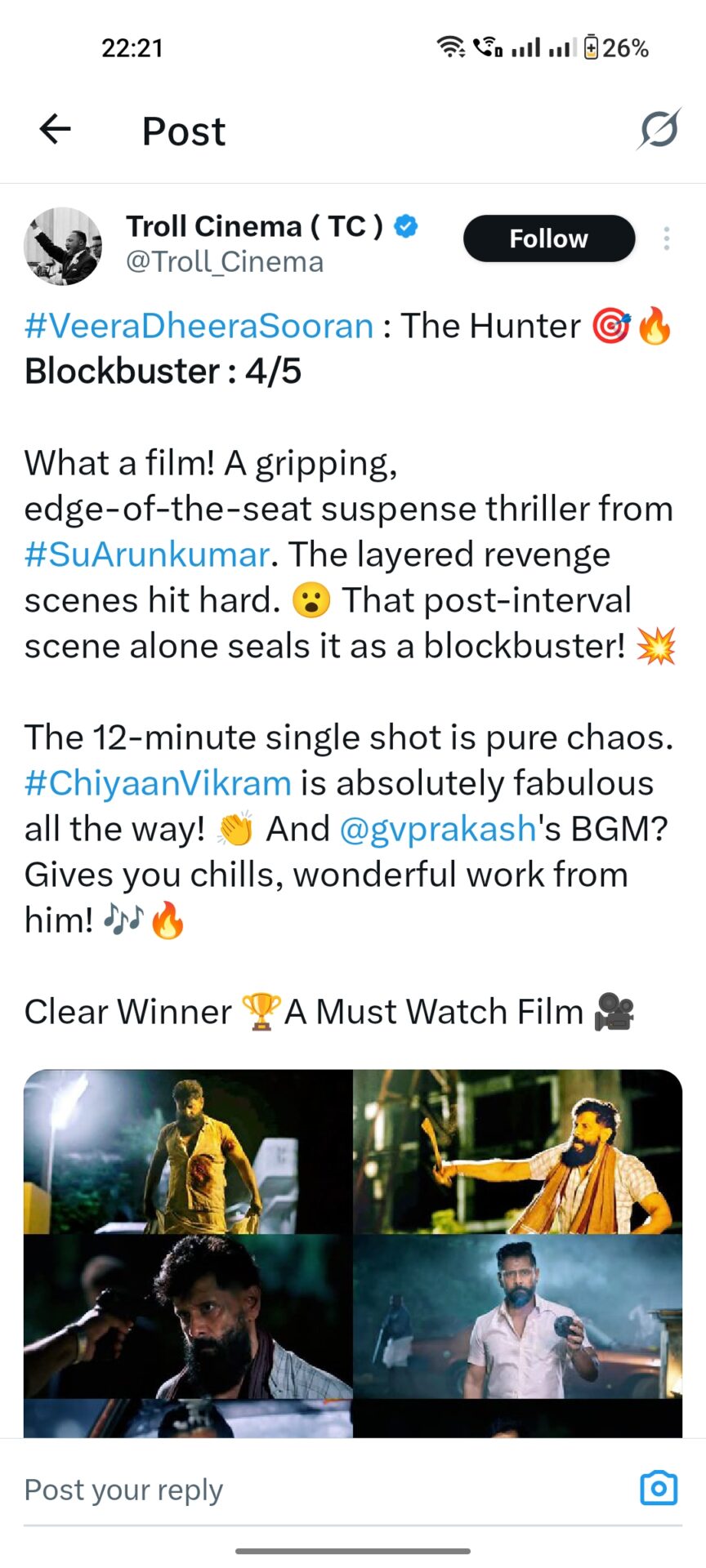அதன் பிறகு மதியம் மூன்று மணிக்கு மேல் நடந்த சமரச பேச்சு வார்த்தையில் உடன்பாடு ஏற்பட்ட நிலையில் மாலை 5 மணிக்கு சில திரையரங்குகளிலும் 6 மணிக்கு மேல் பல திரையரங்குகளிலும் திரைப்படம் வெளியானது. இந்நிலையில் தாமதமாக வெளியான வீர தீர சூரன் திரைப்படம் குறித்த ட்விட்டர் விமர்சனம் வெளியாகி உள்ளது. விக்ரம் இந்த படத்தில் காளி என்ற கதாபாத்திரத்தில் நடித்துள்ளார்.