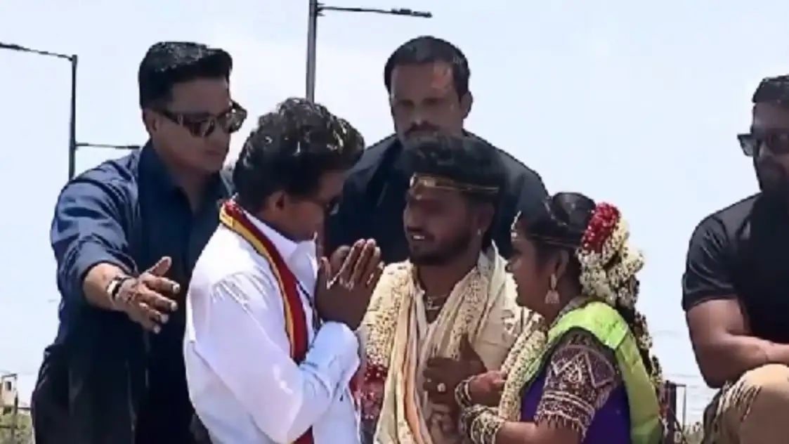 Tamil Nadu is buzzing with marriage muhurthams. On the way to Thiruvallur today TVK chief Vijay stopped to bless a newly-wed couple pic.twitter.com/1uX8HFW0UC