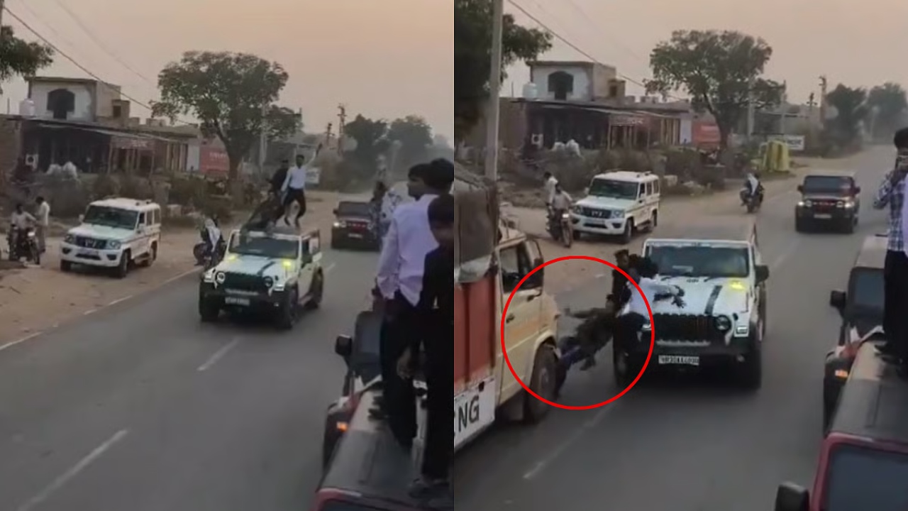 ஹரியானாவின் நுஹ் மாவட்டத்தில் மூன்று இளைஞர்கள் ஓடும் மஹிந்திரா தார் காரின் கூரையில் ஆபத்தான சாகசங்களைச் செய்யும் வீடியோவைத் தொடர்ந்து அதிர்ச்சியூட்டும் சம்பவம் ஒன்று வைரலாகி வருகிறது. ஓட்டுநர் திடீரென பிரேக் போட்டதால், மூவரும் சாலையில் மோதியதால், அந்த சாகசம் கிட்டத்தட்ட உயிருக்கு ஆபத்தானதான தருணமாக மாறியது.